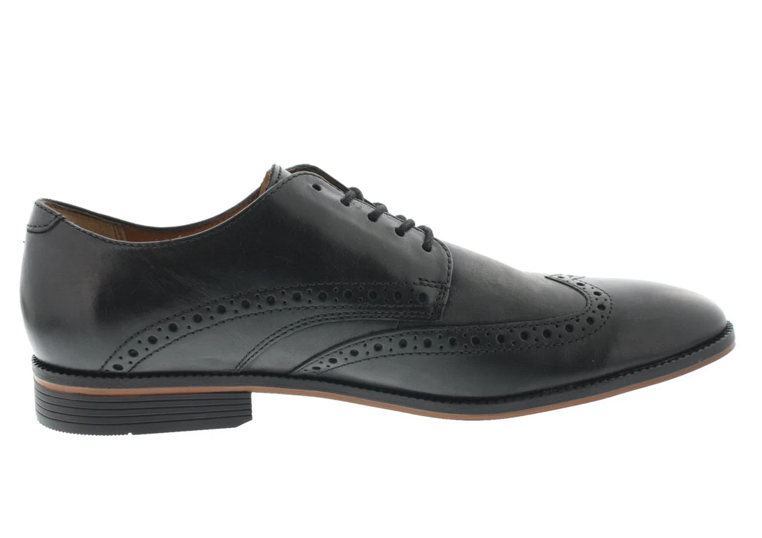 An old-fashioned silhouette is reimagined for this classically stylish mens shoe from the Bostonian Collection. Full brogue provides this smooth tan leather wingtip derby shoe with detailing that adds visual interest to both office outfits and dressed-up weekend attire alike. These clarks oxford shoes feature a cushiony OrthoLite footbed that adds a bit of modern technology to a traditional shoe. One of the men’s most comfortable dress shoes from Clarks.Â