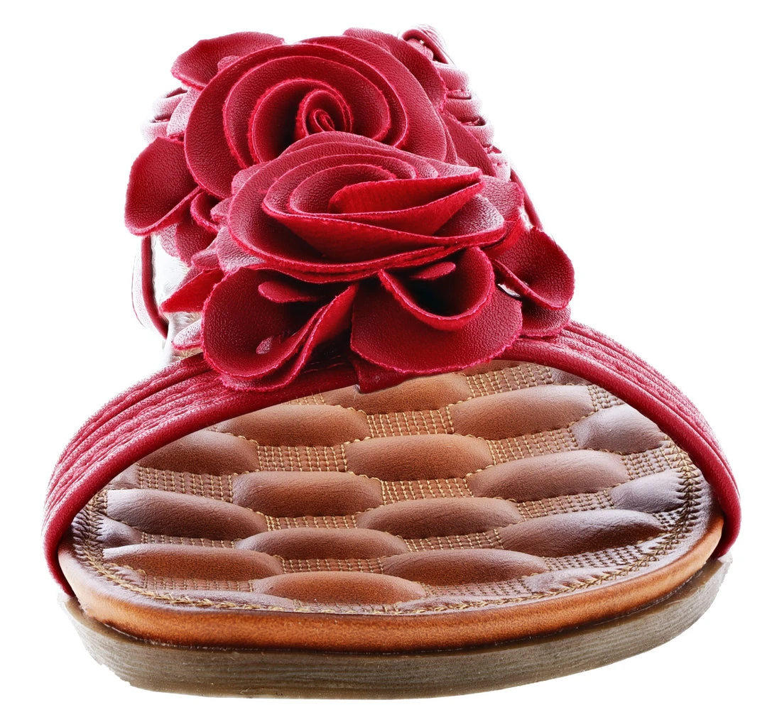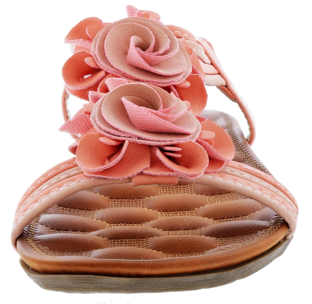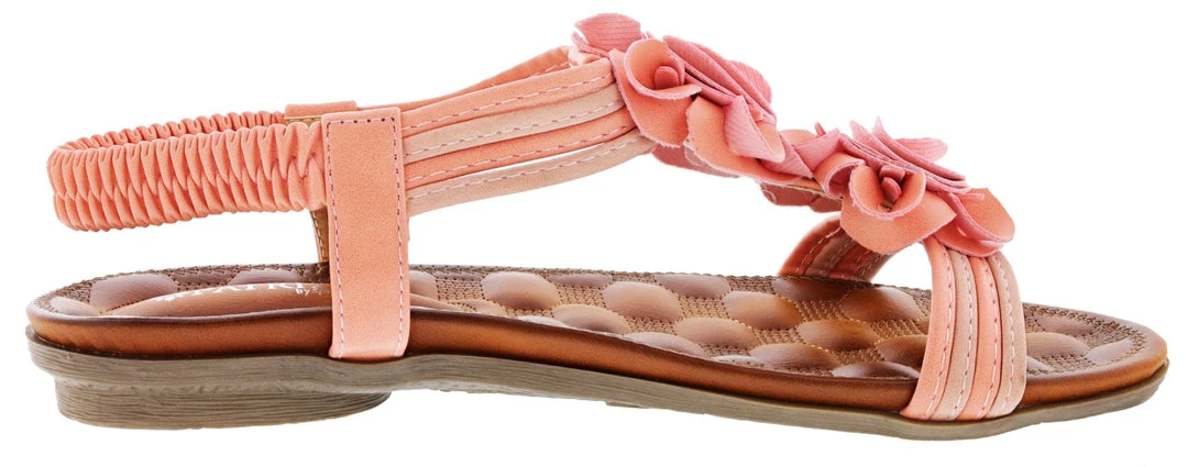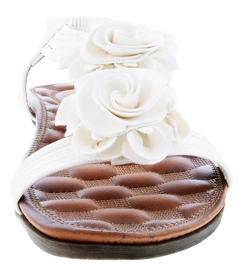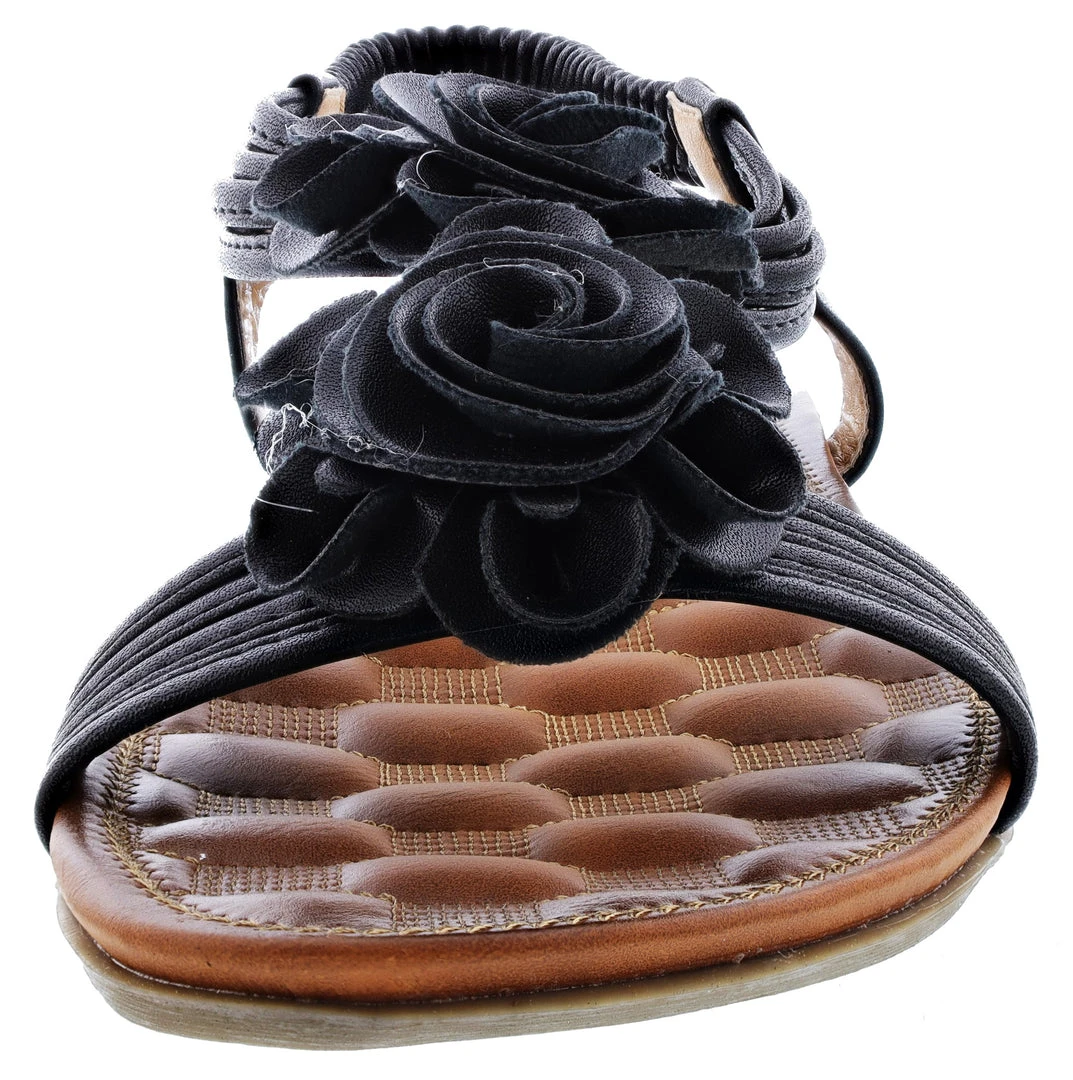- Floral comfort t-strap sandal featuring nature-inspiredflowers and an elasticized back strap.