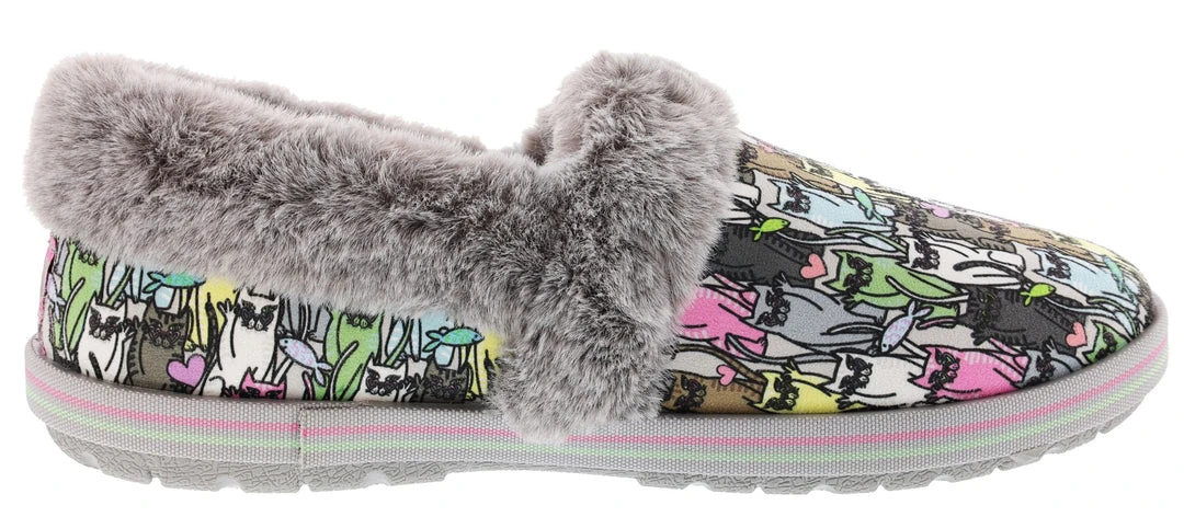 Curl up with your furry friends this season in BOBS from Skechers Too Cozy – Kitten Gloves. This casual ladies Bobs Skechers slipper features a soft microfiber suede-textured upper with an allover ‘Lover Girl’ colorful cat print, faux-fur lining and trim, plus a cushioned Bobs Skechers memory foam footbed. For every BOBS purchase, a donation is made to animals in need. Skechers Bobs meow slippers